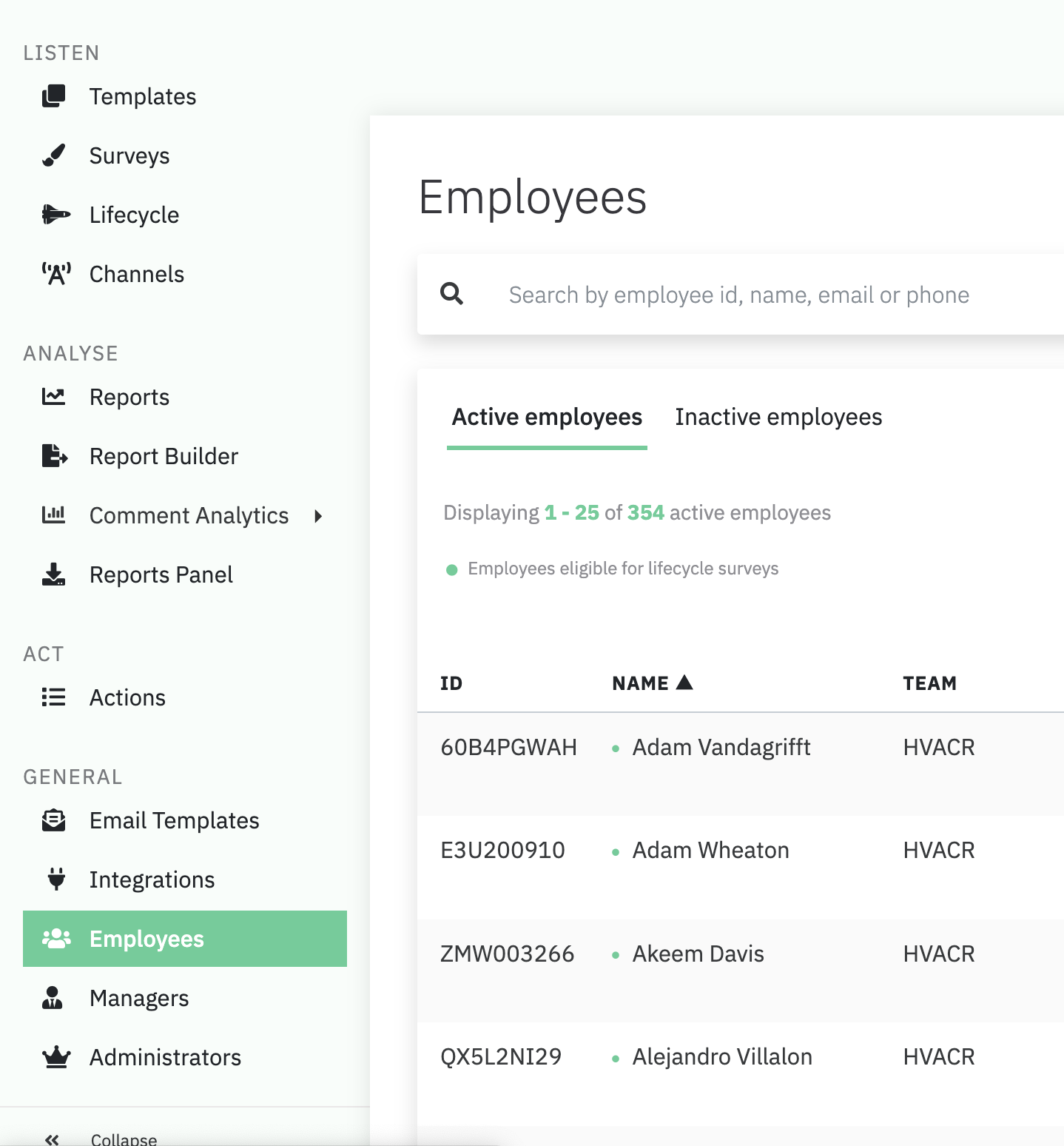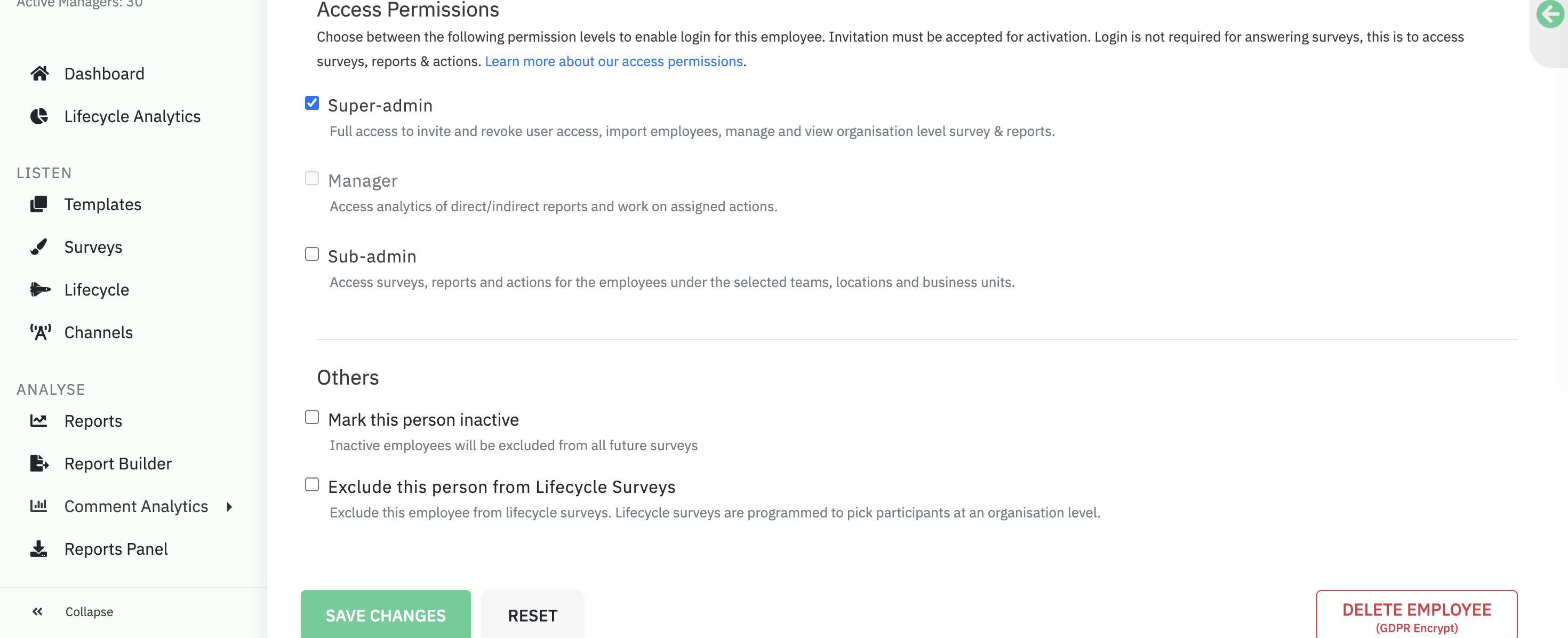 A Sub-admin can be assigned to specific Teams or Locations or Business Units, depending on the demographics they are handling in the organisation.Login to your Super-admin dashboard and go to Employees section on the side-menu.
