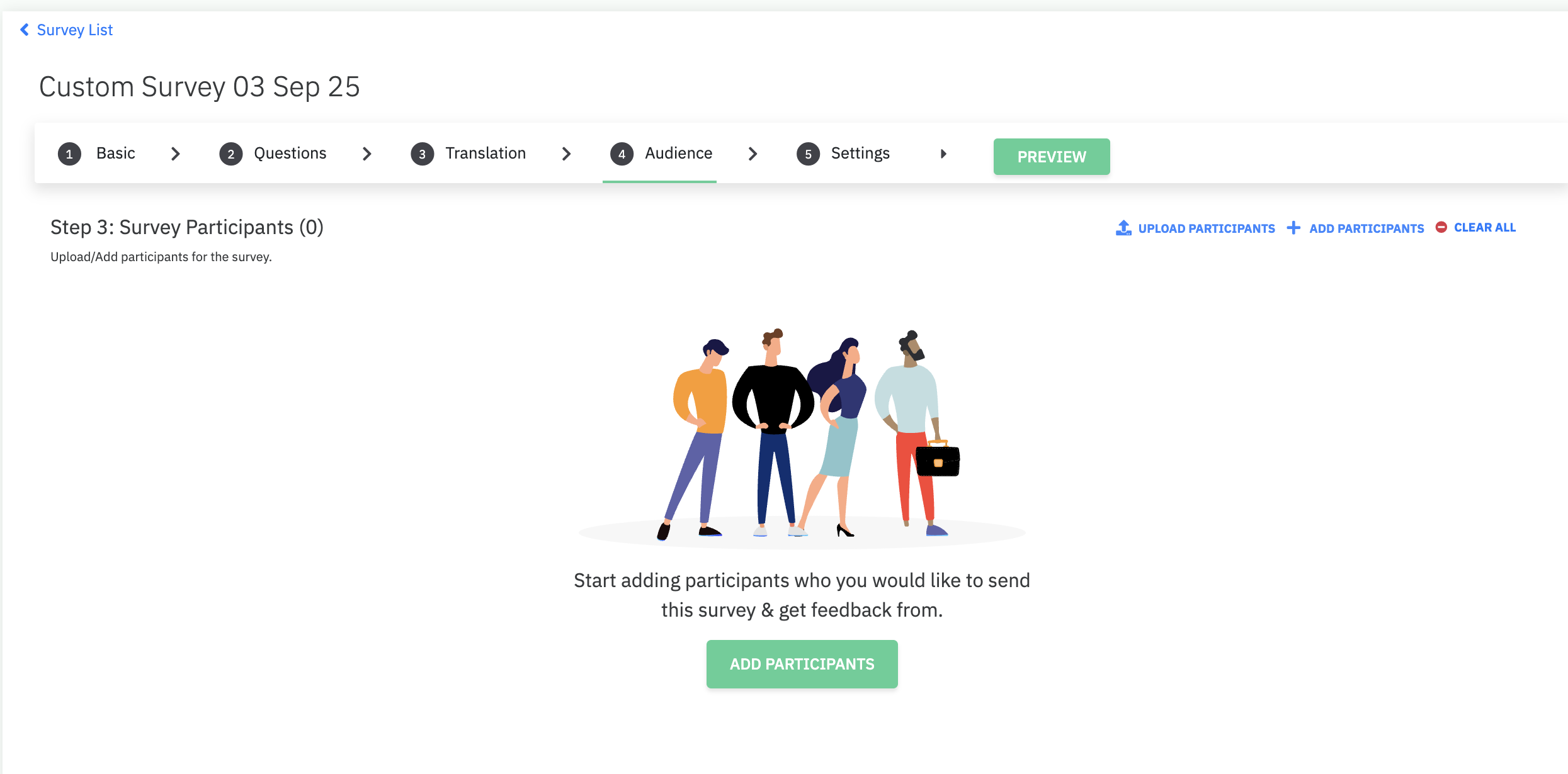 Once you have completed setting up the Basic settings and Questions, you would now be required to add employees as participants to the survey.