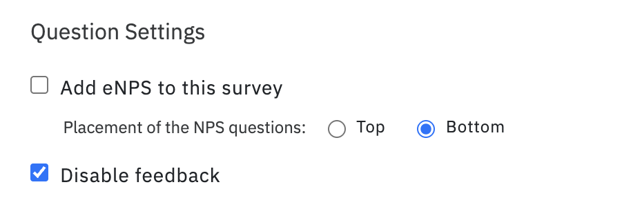 CultureMonkey adds e-NPS and feedback box to the survey by default. However, you can remove the default questions under question settings.