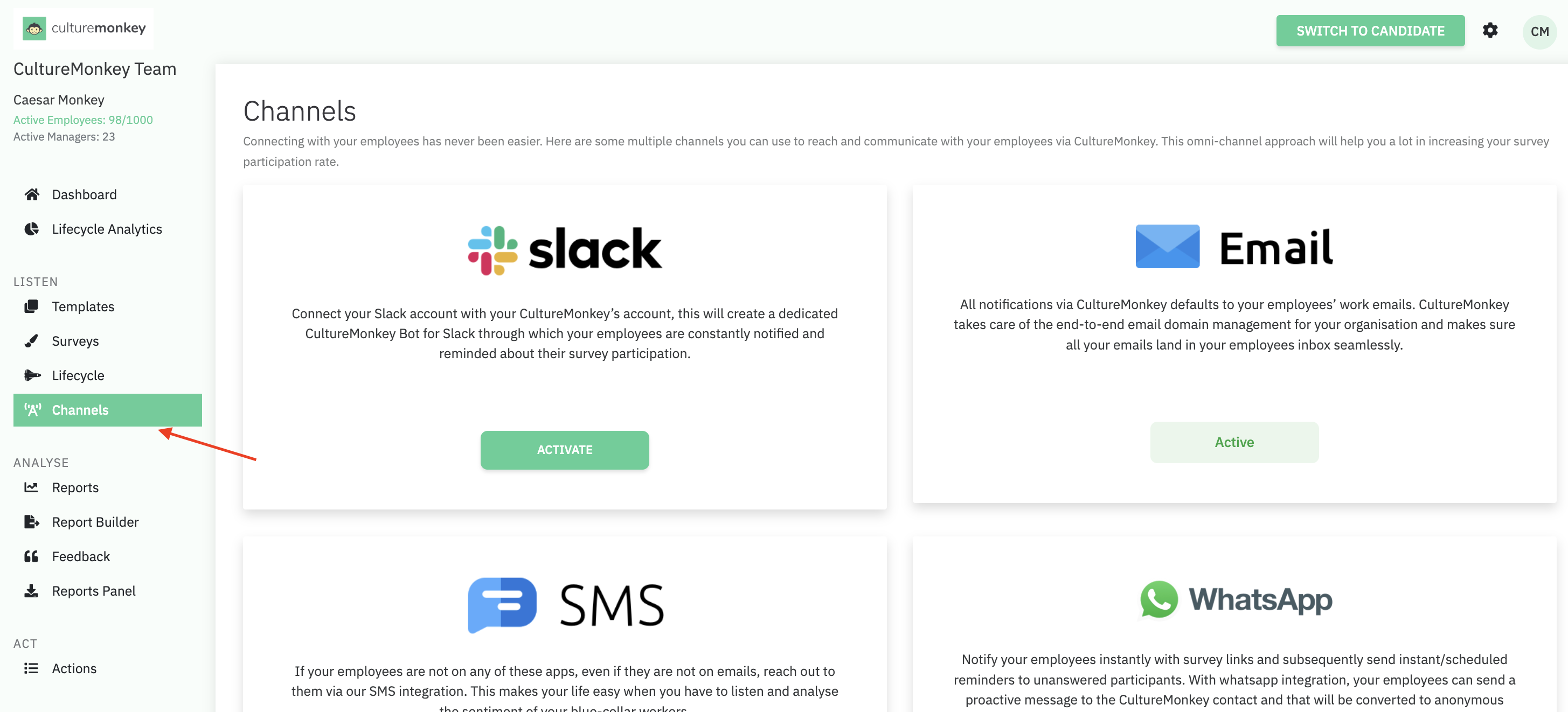 Step 1: Log in to your CultureMonkey account and go to the Channels module from the left panel.