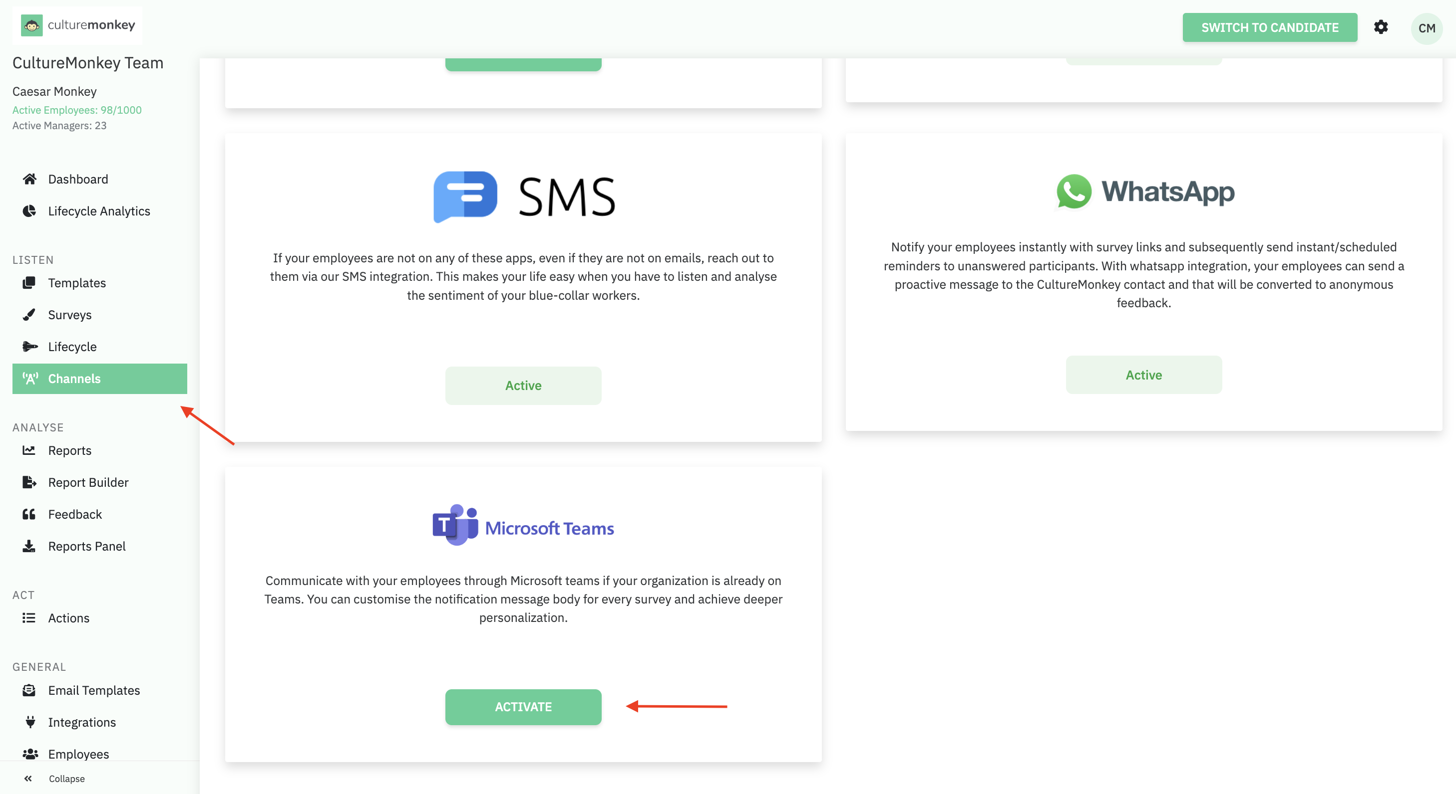 Step 2: On the "Channels" page, click “Activate” within the Microsoft Teams section. You should now be redirected to the Microsoft authentication page. Enter your master or administrator credentials to be able to integrate CultureMonkey with Microsoft Teams.